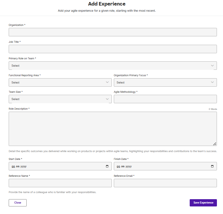 Toplamda 24 aylık deneyim bilgisi girmeniz gereklidir. Çalıştığınız kurum, hangi rolde çalıştığınız, takım büyüklüğü ve projenizdeki çevik metodolojiyi yazdıktan sonra deneyim bilgisini girmeniz gereken alan gelir. Burada çalıştığınız her projeyi açıklamanız beklenir. Sorumlu olduğunuz alanları burada anlatırsınız. Ve her proje için referans kişi göstermeniz ve ilgili kişiye ulaşılabilecek mail bilgisi vermeniz gereklidir.